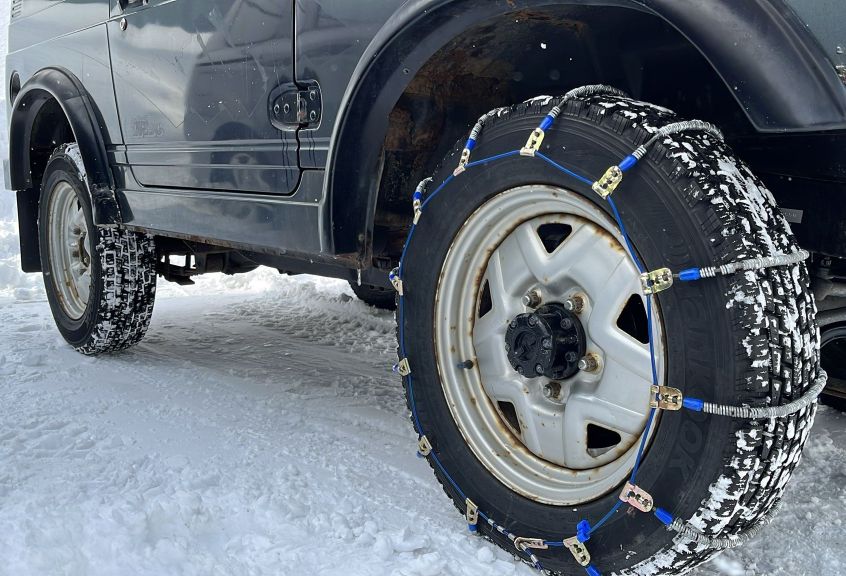 1本(1組の半分)切れたので再度新しいのをGET。ラジコンの方ばかりで1/1オモチャのJA11も遊べるようにします。タイヤチェーンを取り付けてブレーキ制動距離を減らします。
