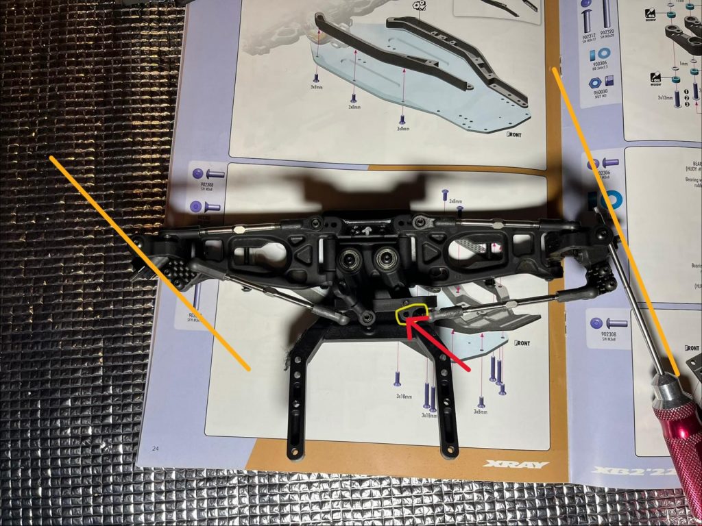 カーペット仕様からダート仕様でステアリングリンケージを組み付けした時、全然曲がらなかった。右側があまり切れていない。 原因は、取り付けの穴の位置間違いだった。ところが、間違えずダート仕様の組み付けでも右側(外側)は切れ角がマイルドで狭い幅のコースでは厳しいと。