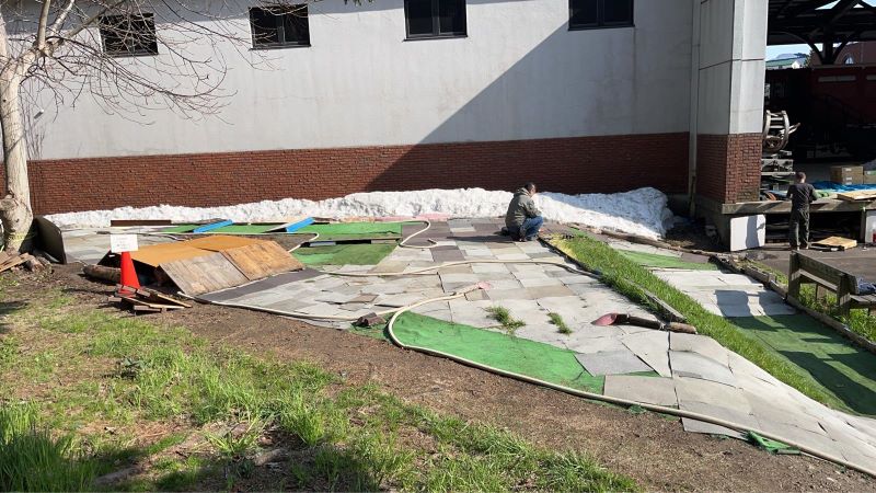 午後からオフロードコース「buggy」「Rally」の構築。タイルカーペットをペグ?で打ち込み。土の下に石ころがありペグが曲がる。